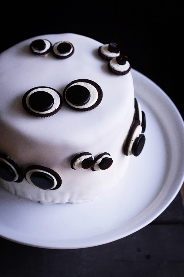 Drückt einen Lakritzdrop als Pupille auf eine Kekshälfte. Und klebt jeweils zwei Kekshälften mit etwas Buttercreme an der Torte fest.