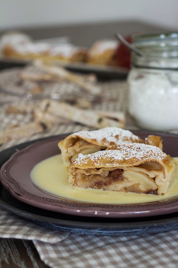 Am allerbesten schmeckt der Strudel lauwarm, mit etwas Puderzucker bestäubt und in einem Bad aus Vanillesauce. Achja. Eine Kugel Vanille oder Walnuss-Eis würde sich auch ganz famos mit dem Strudel vertragen.