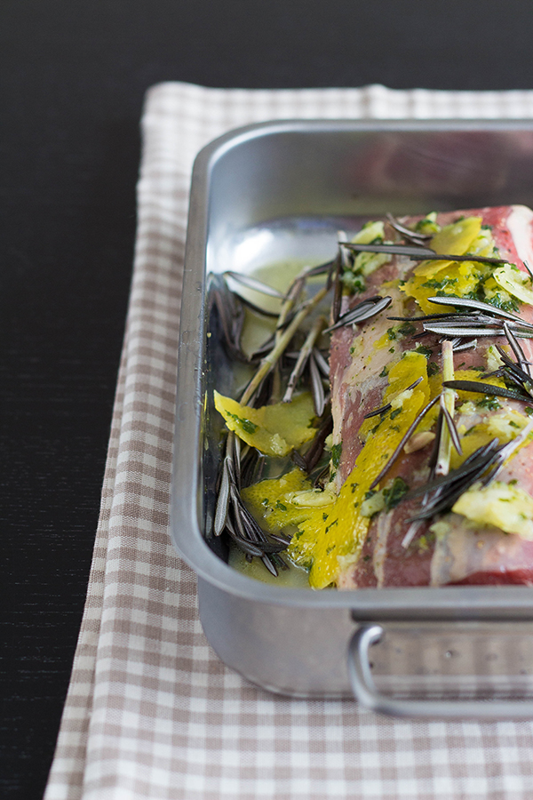 Die Zitrone waschen, mit einem Sparschäler dünn schälen und dann auspressen. Zitronenzesten, Minze, Knoblauch und Zucker in einen Mörser geben und mit dem Olivenöl ordentlich mörsern. Dann den Zitronensaft dazu geben. Das Lammkarree mit der Marinade einpinseln, reichlich Pfeffer darüber mahlen und die Rosmarinzweige darauf legen. Abgedeckt im Kühlschrank marinieren lassen. Mindestens zwei Stunden, noch besser wäre es über Nacht.