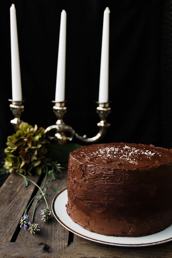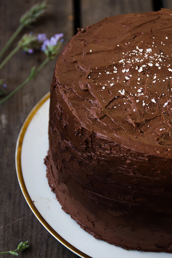 Dann geht´s ans Finish: Verteilt den restlichen Fudge auf der Torte. Ich nehme dazu eine Palette. Dann nur noch mit ein paar Fleur de Sel Kristallen bestreuen. Und schon mal einen Vertrag im Fitness-Studio abschließen. Denn diese Torte ist mächtig mächtig.